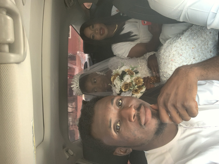 A selfie-style photograph depicts three individuals inside a vehicle in Ankpa, Nigeria. In the foreground, an adult male with a beard and mustache, wearing a white traditional top, looks directly into the camera, his right hand resting under his chin. Seated in the rear of the vehicle, behind the male, are two adult females. The female on the left, identified as a bride, wears a white, heavily beaded bridal gown, a tiara, and a veil, holding a bouquet of white and gold artificial roses. Her gaze is slightly averted from the camera. The female on the right, wearing a white dress and a gold-colored necklace, smiles towards the camera while holding a red smartphone in her left hand. The vehicle's interior features a light-colored headliner and dark seat upholstery. A blurred outdoor background, indicative of an urban or semi-urban setting, is visible through the rear window.