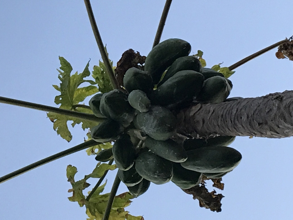 - "A low-angle shot of a papaya tree shows a cluster of green, unripe papayas growing near the top of the trunk" by FM-SN8fT2, licensed under CC BY 4.0