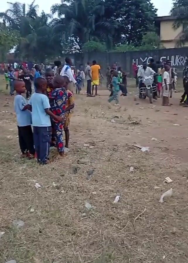 The video depicts a daytime outdoor scene with a large group of people, primarily children, gathered in what appears to be a park or open field. The ground is covered in dry grass and scattered litter. In the foreground, a group of young children are standing together, looking towards the larger crowd. Some adults can also be seen among the crowd. A person wearing a red dress is walking through the crowd, carrying a yellow container on their head. A motorcycle is parked amidst the crowd. A building with writing on the side is visible in the background, partially obscured by trees. Overall, the scene appears to be a gathering of people, possibly for an event or activity.