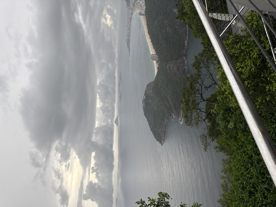 Overcast skies dominate a view overlooking a coastline. A long beach stretches along the water's edge, bordered by a city. An island, densely covered in vegetation, juts into the ocean. The sea is gray and textured. Foliage and a metal railing frame the scene on the right, suggesting the viewpoint is from a high vantage point. The overall scene is muted in tone.
