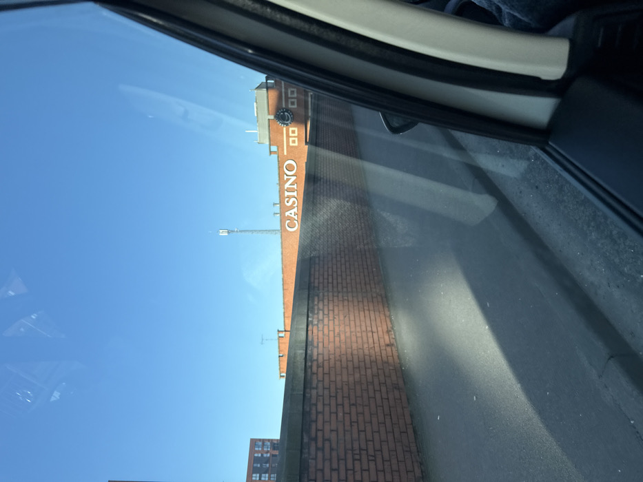 The image presents a daytime exterior view of the Grosvenor Casino Salford, located at Merchants Quay, Salford, United Kingdom, captured from inside a vehicle. The prominent subject is a multi-story building constructed of orange-red brick, featuring large white letters spelling "CASINO" on its upper facade. To the right of the "CASINO" signage, a dark-faced clock with a light-colored bezel is affixed, flanked by two square recesses. Above the casino structure, a tall, slender communication tower equipped with multiple antennas is visible against a clear, bright blue sky. To the far left, a modern, multi-story residential building, also of brick construction, is partially visible. In the foreground, a low wall built from orange-red brick with a dark coping runs horizontally across the scene, separating the street level from the casino building. Below this wall, a dark asphalt surface, consistent with a pavement or road, is illuminated by direct sunlight, casting distinct diagonal shadows. The right side of the frame is occupied by elements of the vehicle's interior, specifically a portion of the window frame, the side mirror, and reflections on the glass. No individuals or specific activities are discernible within the visible environment.