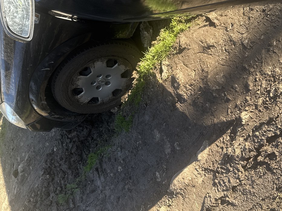 - "A black vehicle, consistent with a sedan or hatchback, is depicted with its front right wheel deeply embedded in a dark, wet, muddy unpaved surface" by FM-40rHI3, licensed under CC BY 4.0