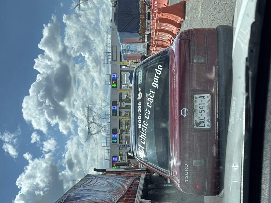 The image displays the rear view of a stationary burgundy Nissan Tsuru sedan at a multi-lane toll plaza in the State of Mexico, Mexico