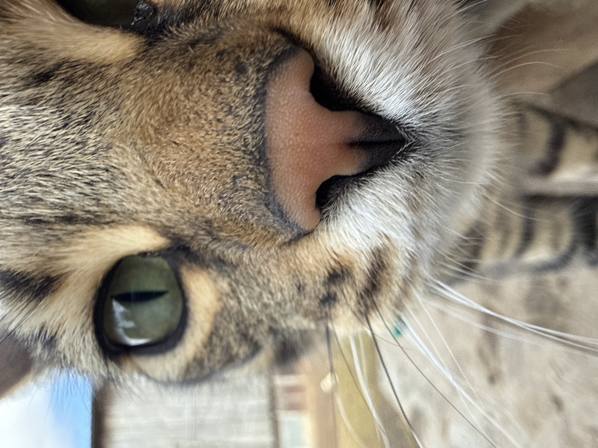 A close-up, slightly rotated, image of a tabby cat's face. The pink nose is centered. One green eye is visible on the lower left. White whiskers extend from the cat's muzzle. The background is blurry and provides no definitive information about the location in Дойная, Russia. There are no people, actions, or interactions visible.