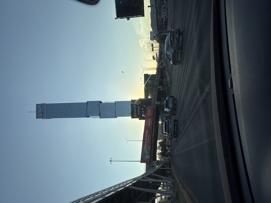Captured from within a vehicle, the image shows a cityscape featuring a prominent, modern skyscraper with "BBVA" displayed near the top