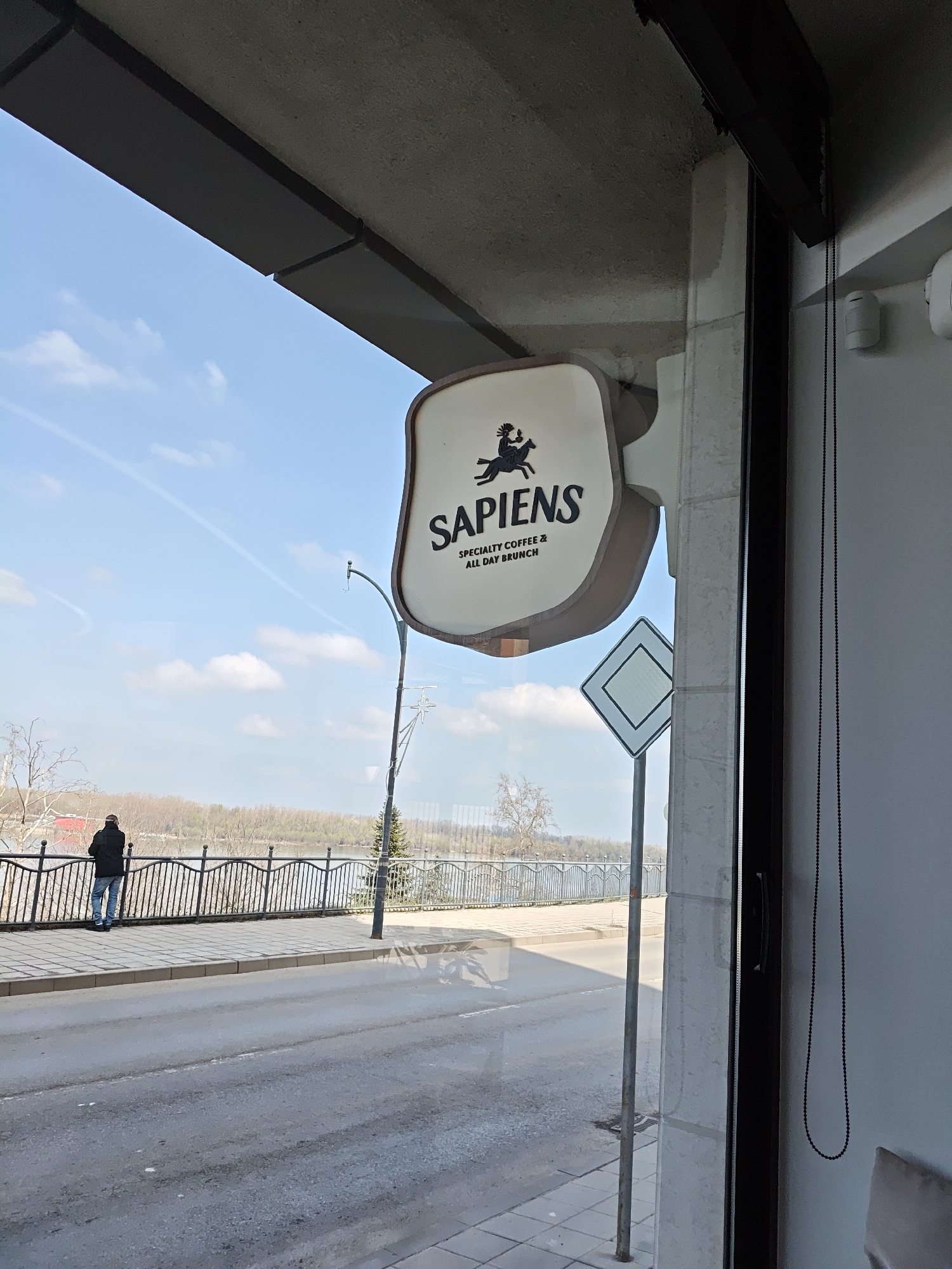n exterior view of a cafe in Ruse, Bulgaria, named "Sapiens," which offers specialty coffee and all-day brunch. The view is seen through a window, and a sign with the cafe's logo is visible. Outside, a person stands by a fence looking at a river, probably the Danube River. A road runs along the river, and there's a street lamp and a yield sign. The weather appears to be sunny with some clouds in the sky. Inside, parts of the cafe are visible, including the wall and window frame.