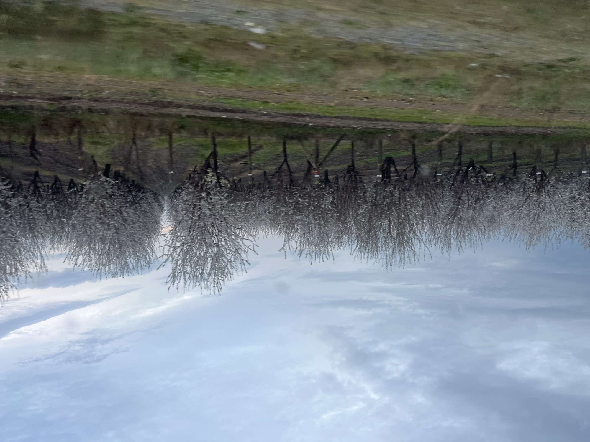 The image displays an extensive agricultural landscape identified as an orchard in the vicinity of Topolchane, Bulgaria. The foreground features a strip of unpaved ground with sparse green vegetation and exposed dark soil, exhibiting minimal motion blur. Beyond this, a rudimentary fence line is visible, consisting of vertical wooden posts, some connected by a thin wire. The midground and background are occupied by numerous deciduous trees, appearing to be in full white blossom, arranged in organized, receding rows over dark, tilled earth. Small, light-colored tags or labels are affixed to branches of several trees within the orchard. The sky above is overcast, predominantly gray with lighter blue and subtle pinkish hues visible towards the right horizon. No individuals or animate subjects are present. The scene is static, representing an agricultural setting during the spring season.