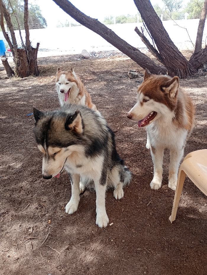 - "Three husky dogs occupy a sun-drenched, outdoor space" by FM-skUe82, licensed under CC BY 4.0