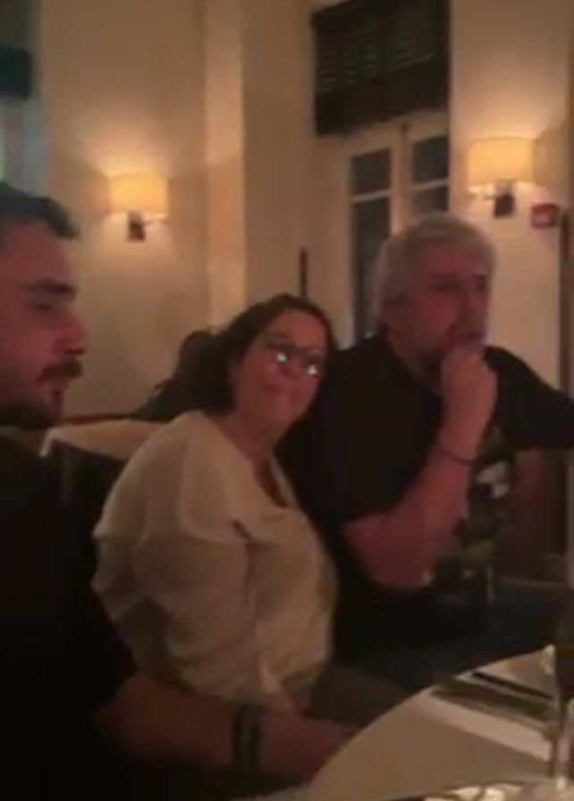 group of people enjoying a meal together in a dimly lit restaurant. The camera pans across a long table set with wine glasses, plates, and candles. Diners are seated along both sides of the table, engaging in conversation and laughing. They appear to be a mix of older and younger adults, dressed in casual attire. The restaurant has windows with closed blinds, adding to the intimate atmosphere. The overall impression is one of a lively and convivial gathering.