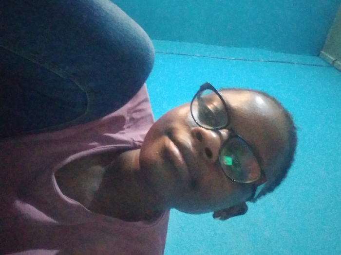 An individual with dark skin is captured in a close-up, upward-angled shot. The person wears black-framed cat-eye style glasses, a light pink crew-neck t-shirt, and partially visible blue denim jeans on the left. Their head is slightly tilted to the right, and their gaze is directed towards the camera. The background consists of a solid bright blue wall, exhibiting a subtle vertical seam or structural line towards the upper left. The lighting is even, consistent with an indoor environment. The scene is located in Ipetumodu, Nigeria.