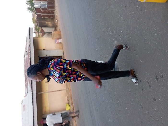 The image displays a street scene in Jos, Nigeria, featuring two individuals and several structures. In the immediate foreground, an adult female with dark, braided hair walks leftward on a paved road. She wears a short-sleeved t-shirt with a vibrant, multi-colored geometric pattern, dark trousers, and silver-toned open-toed sandals. She holds a small reddish object in her right hand and has a white item slung over her left shoulder. Her head is turned slightly to her right. Further back on the left side of the road, a male figure wearing a white t-shirt, light-colored shorts, and a red cap walks away from the camera. The background consists of low-rise buildings with light brown/tan facades and corrugated metal roofs. A yellow bag is visible on the ground near the first building on the left. Further right in the background, a structure constructed from corrugated metal sheets is visible. The road surface is dark grey asphalt. A yellow cylindrical object is partially visible in the bottom right corner of the frame. The scene is illuminated by natural daylight.
