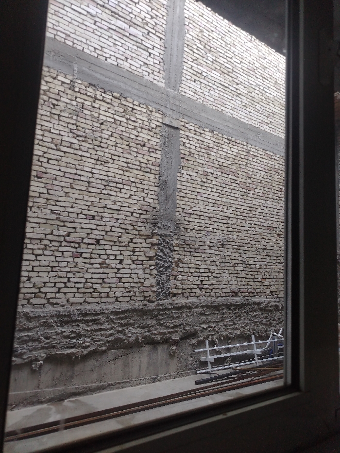 The image depicts an outdoor construction or renovation site in Bukhara, Uzbekistan, viewed through a dark-framed window. The central feature is a tall wall constructed from light-colored bricks, with visible, rough grey mortar lines. This brickwork is reinforced by prominent, unfinished grey concrete structures: a vertical column extends upwards, intersected by a horizontal beam, forming a cruciform pattern across the wall surface. The lower portion of the brick wall, below the horizontal concrete beam, is covered with a thick, uneven layer of textured grey concrete or mortar. Below this, the ground level consists of a smoother, light grey concrete surface. On this ground, in the immediate foreground, two parallel metallic rods or pipes are positioned horizontally. Further back, against the base of the wall, various construction materials are present, including white metal grating or railing sections and dark, undefined pipes or rods. The scene is illuminated by natural light from an unseen overhead source. No individuals are present.