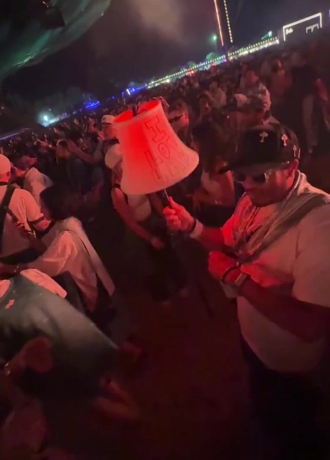 crowd of people at night, seemingly at an outdoor event or festival. The main focus is on a man in the foreground holding up a lit-up lampshade with the word "LAMP" written on it. He's wearing sunglasses, a cap, a white shirt, and what looks like a scarf around his neck. He moves the lampshade up and down, seemingly dancing or enjoying the music. The lighting is dim with red and green lights flashing around the scene, adding to the festive atmosphere. In the background, there are more people dancing and moving, with some kind of light display or structure visible in the distance. The ground appears uneven and dusty.