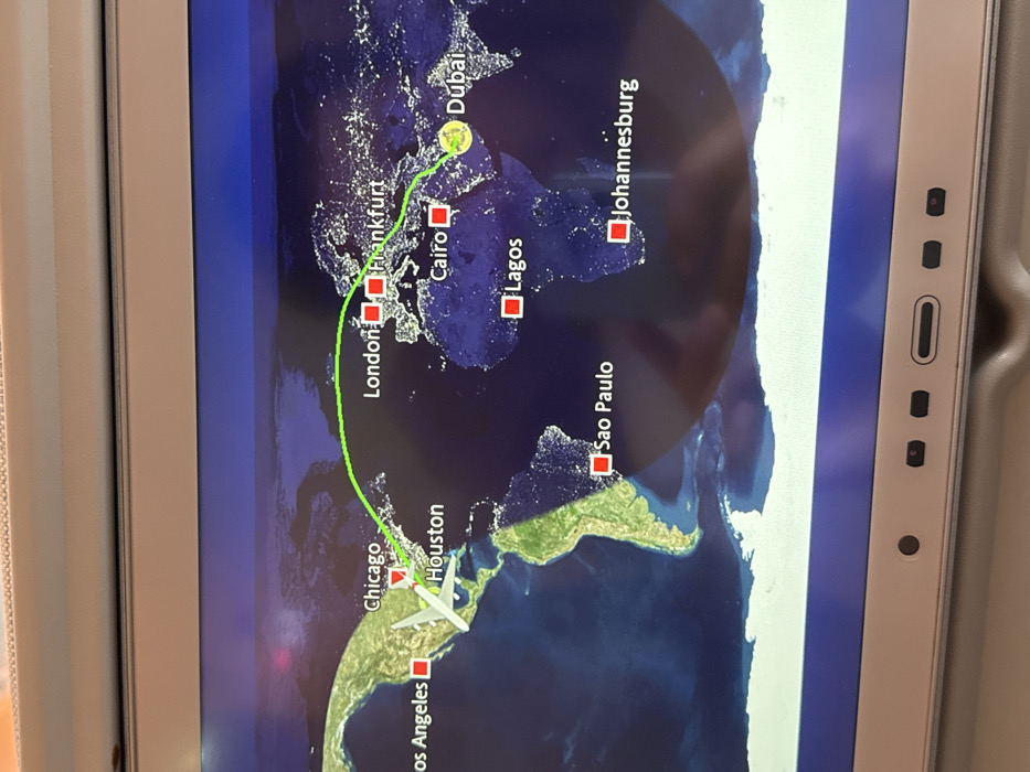 An in-flight entertainment screen displays a map showcasing the flight's trajectory. Originating near Los Angeles and currently positioned around Houston/Chicago, the flight path, depicted by a green line, heads toward London and Frankfurt, with Cairo and Lagos off to the side. The destination appears to be Dubai, as labeled on the map, with Johannesburg further to the side. Sao Paulo is visible in South America. A cartoon airplane icon indicates the current position of the aircraft.