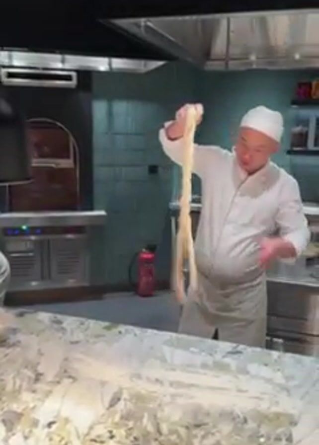 A chef in a white uniform and hat is preparing dough in a professional kitchen. He manipulates a long, twisted strand of dough, tossing it in the air and then laying it out on a marble countertop covered in flour. An oven is visible in the background, along with various kitchen equipment. The kitchen has a modern design with turquoise tiled walls and stainless-steel fixtures.