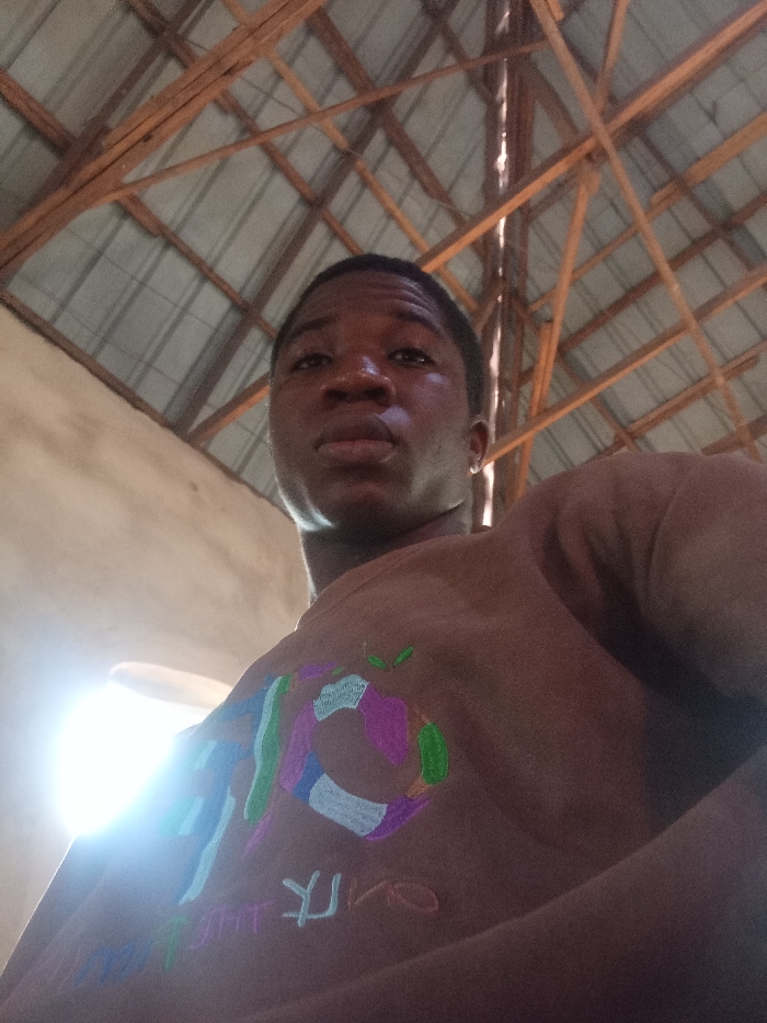 A single individual, a male with dark skin and short dark hair, is depicted in a low-angle, head-and-upper-torso shot, looking directly into the camera