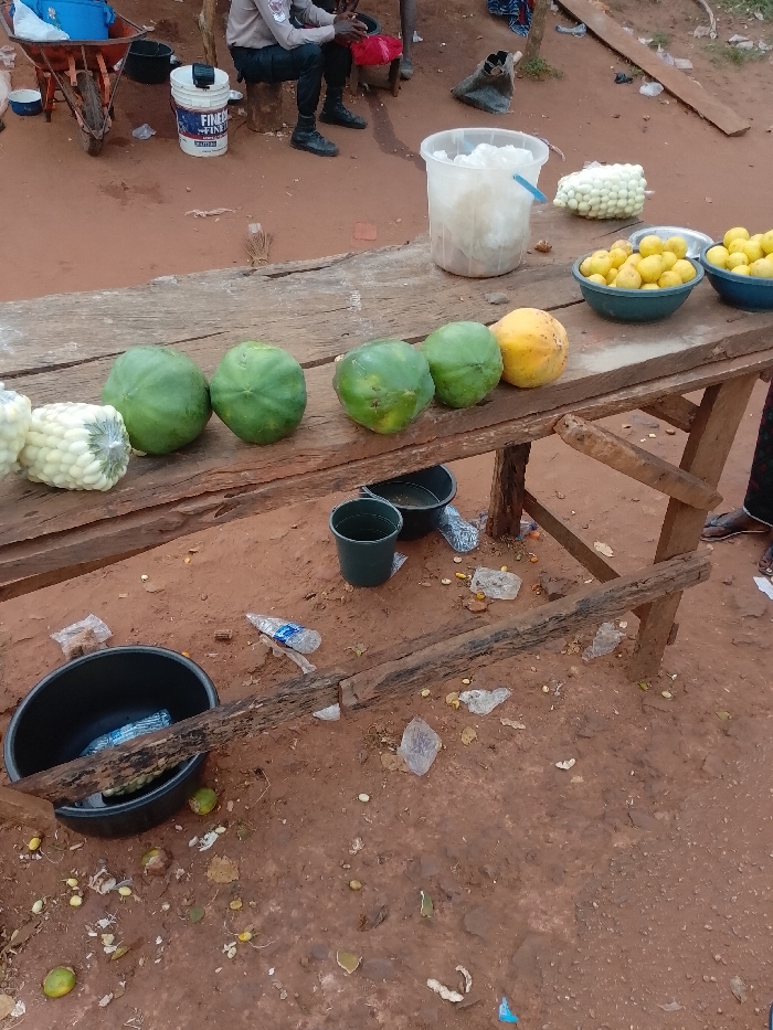 This image depicts an outdoor vendor stall in Ejule, Nigeria, characterized by a rustic wooden table displaying various produce. On the table, from left to right, are two ears of corn wrapped in clear plastic, four green papayas, one yellow-orange papaya, and two metal bowls each filled with numerous small yellow citrus fruits (likely lemons or limes). A large, clear plastic bucket filled with crushed ice or a similar white substance stands behind the fruit bowls. In the background, a person wearing a light-colored shirt, dark trousers, and dark boots is seated on a low wooden block, partially obscured, appearing to be engaged with an object in front of them. To their left, a red wheelbarrow holds a blue cooler. A white plastic bucket with the word "FINEM" visible on its side is positioned near the seated individual. Another person's lower legs and feet, clad in sandals, are visible on the far right, standing behind the stall. The ground is unpaved, consisting of reddish-brown dirt, and shows signs of discarded items including plastic bags, a plastic water bottle, and fruit debris. Underneath the wooden stall, two dark green plastic buckets are visible, along with a black plastic bowl containing a clear plastic bottle. The overall scene suggests an informal market or roadside sales environment.