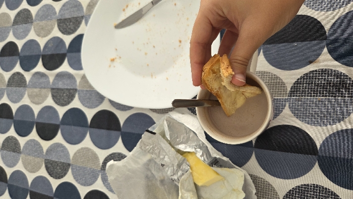 The image displays an overhead view of a table set with breakfast items. A light-colored tablecloth features a repeating pattern of large circles, each divided into two semicircles of varying shades of blue, gray, and beige. In the center-left, a white ceramic mug contains a light brown liquid, likely hot cocoa or coffee, with a silver spoon submerged. To its right, a light-skinned hand holds a torn piece of light brown bread, possibly a croissant or toast, partially dipped into the mug's contents. In the upper right quadrant, a white oval plate, mostly empty, shows orange-brown crumbs and residue, suggesting consumption of baked goods. A silver knife rests diagonally on this plate. To the left, a stick of yellow butter, partially unwrapped from its silver foil and white paper packaging, is visible on the tablecloth. The scene appears to be an indoor setting, likely a domestic environment or a cafe. No specific visual elements in the image allow for the identification of a precise location within the city of Valencia, Spain.