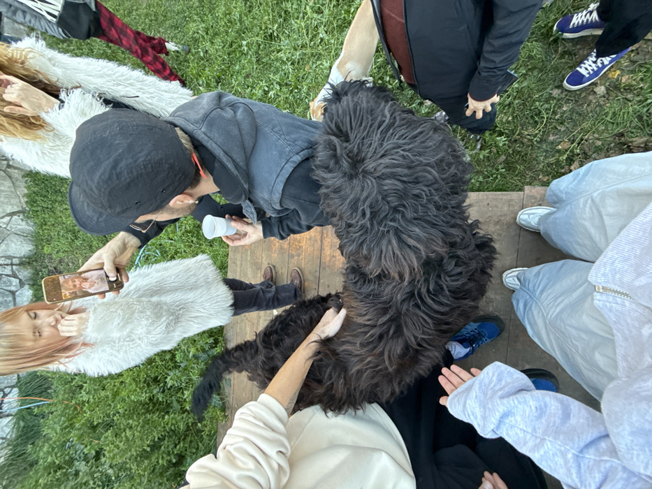 The image depicts a casual outdoor gathering of at least six individuals and two dogs on a wooden platform surrounded by green grass. The specific location within Budva, Montenegro, is not discernible from the visual information. In the center, a large, black, curly-haired dog stands on the wooden platform, being petted by a person in a light beige sweatshirt whose hands are visible on the dog's back. To the left of the dog, the lower body of an individual wearing light blue wide-leg pants and white sneakers is visible, with their left hand open towards the dog. To the right of the dog, a male individual is seen from an elevated angle, wearing a black cap, a dark grey hoodie, and a dark vest. He has a beard and an earring. He holds a white disposable cup in his left hand and a gold-colored smartphone in his right hand, oriented towards a young female. The phone's screen displays an image of the young female. The young female stands to the male's left, wearing a white long-pile faux fur coat, dark pants, and brown shoes. She has light blonde/pink hair and is looking at the smartphone, with her right hand near her mouth. To the male's right, a person wearing a white long-pile faux fur coat and red plaid pants is partially visible, with their hand near their face. On the far right, the lower legs and blue sneakers of another individual are visible. A lighter-colored dog is partially visible behind the black dog on the right side of the platform. The background consists of green foliage, a stone wall, and colorful strings in the upper left. The scene is illuminated by natural daylight.