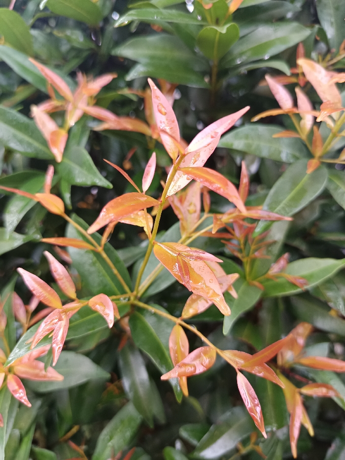 The image displays a close-up, vertical-orientation view of a plant featuring a dense arrangement of foliage. The foreground exhibits numerous developing leaves in shades of reddish-orange and peach, transitioning to a deeper green for the more mature leaves in the midground and background. Small, clear water droplets are visible on the surfaces of many leaves, particularly on the prominent reddish-orange ones, suggesting recent rainfall or dew. The leaves are ovate with slightly pointed tips. The background is softly blurred, showing a continuation of green foliage, indicating a shallow depth of field. No other subjects, individuals, or discernible man-made objects are present. This scene is located in Ouderkerk aan de Amstel, Netherlands.