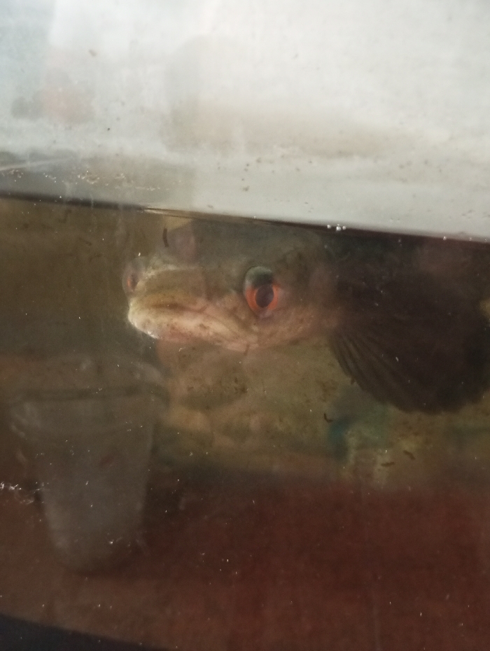 The image depicts a close-up view of a fish contained within an aquarium or tank. The location in the city of Aktash, Uzbekistan, cannot be determined from the visual evidence. The primary subject is a single fish, likely a predatory species, observed from the front-side. Its head is prominent, featuring large, round eyes with distinct reddish-orange irises and dark pupils, positioned laterally. The fish's mouth is closed, and its snout appears somewhat broad and pale. The visible body portion is dark, possibly greenish-brown, with a dark, fan-shaped pectoral fin extending on the right side of the frame. The fish is submerged in murky, brownish-green water, which occupies the lower two-thirds of the image. A distinct water line is visible, with a narrow gap of air above it. The water surface displays a few small bubbles. The tank's front panel, through which the image is captured, appears to have some sediment or smudges. The background within the tank is indistinct, showing dark, possibly algal, growth. Above the water line, the environment behind the tank appears as an out-of-focus, light-colored surface, possibly a wall, with visible dirt or smudges on the tank's exterior glass. The fish is stationary, positioned facing outwards from the tank. There are no other visible people, animals, or significant objects in the immediate foreground or background that provide further context.