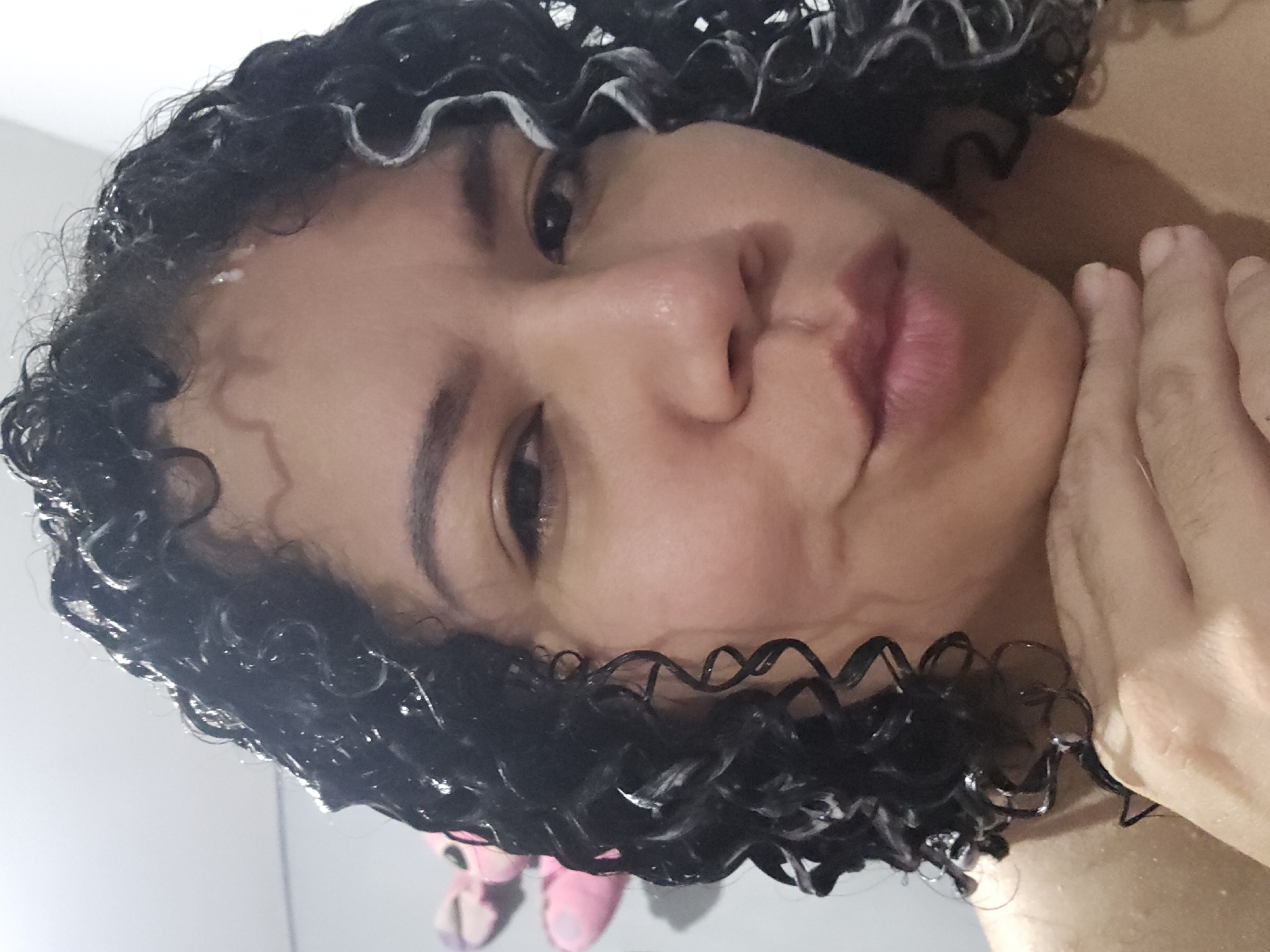 An indoor, chest-up portrait features an adult female with dark, wet, curly hair, exhibiting visible product application or residue. She directly faces the camera with her lips slightly pursed, while her right hand supports her chin. Her shoulders are bare. The background consists of a plain, light-colored wall, with two blurred, indistinct pink objects positioned to the upper left. The setting is an unspecified indoor location, potentially in Perímetro Urbano Cúcuta, Colombia.