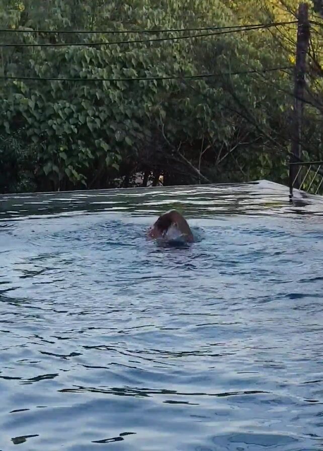 A person in an orange swimsuit swims in a blue body of water, moving towards the right. The person’s movement creates waves and ripples on the water’s surface. On the left, green trees are visible, with utility poles and wires interspersed among the branches.