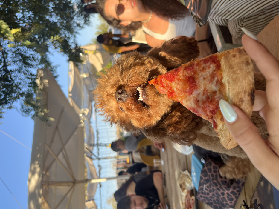 This image depicts an outdoor dining scene in Kfar Ruth, Israel. In the foreground, a human hand with light-colored nail polish holds a triangular slice of cheese pizza, presenting it to a medium-sized brown curly-haired dog positioned directly behind it. The dog faces forward, its mouth slightly agape, revealing teeth, and its gaze is fixed on the pizza. The dog's fur appears fluffy and well-groomed, illuminated by natural light, suggesting an outdoor setting during daylight hours. In the mid-ground, other patrons are visible. To the right of the dog, a woman with dark curly hair, wearing a white tank top and sunglasses on her head, is partially obscured. To the left, a man in a dark shirt is seated at a wooden table, looking down at a mobile device. Further back, additional blurred figures are seated at other tables. The environment includes several large, light-colored patio umbrellas overhead, casting diffused light. Green foliage is visible in the upper right background. The tables appear to be made of wood. On the table to the left, a leopard-print bag and various food items, including what appears to be another pizza, are present. The sky above is clear and blue.