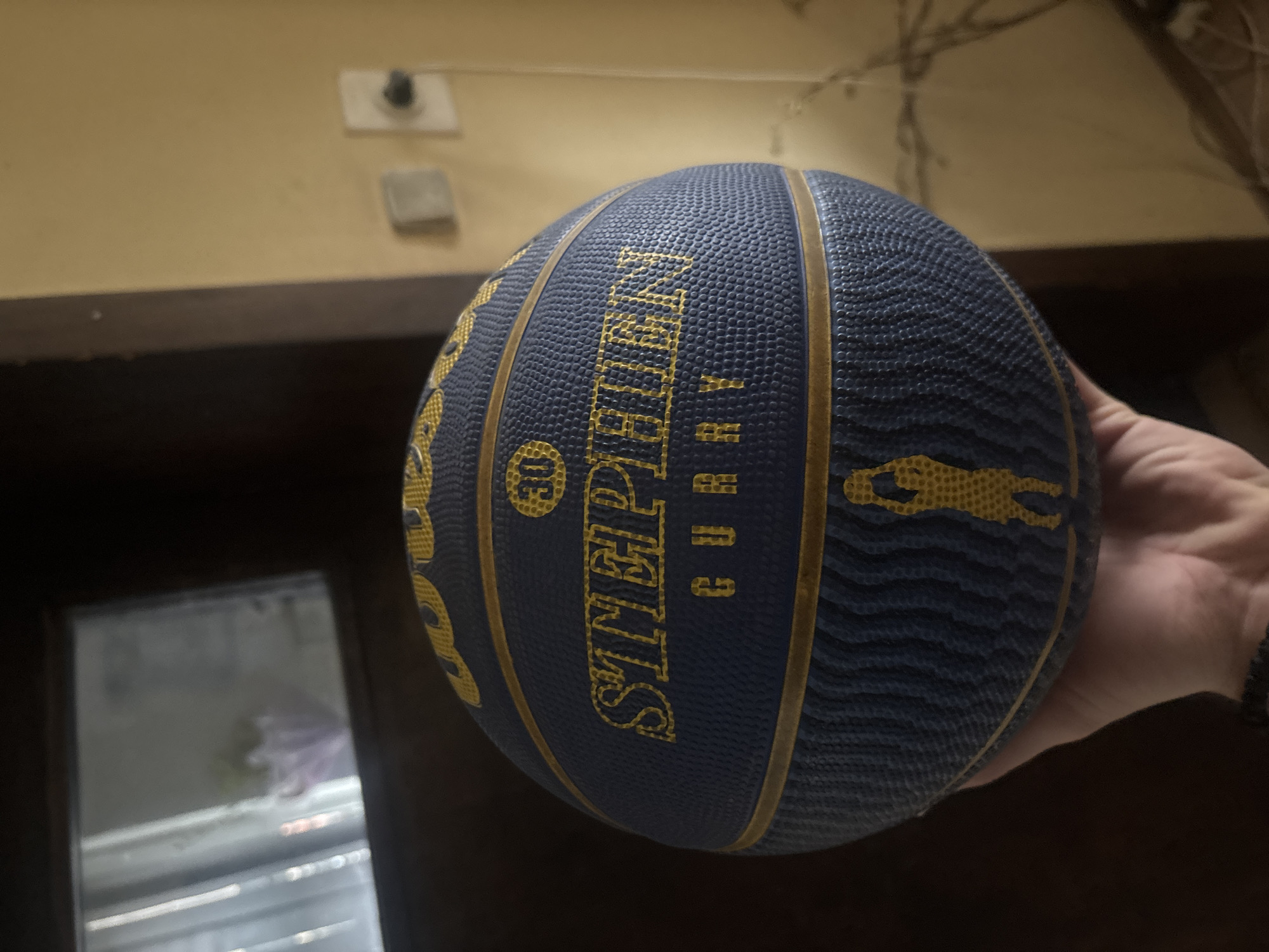 A blue and yellow basketball, imprinted with "Stephen Curry" and the number 30, is held by a hand. The background shows a cream-colored wall and a glimpse of an interior, possibly Cherven Bryag, Bulgaria. A light switch is visible on the wall.