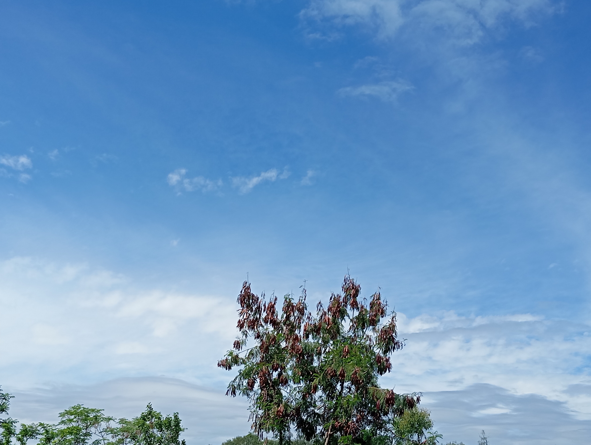 The photograph captures a clear, bright sky punctuated with wispy clouds above the city of Lassan, Pakistan. Below the open sky, the top of a tree is prominently featured, its branches adorned with green leaves and brown seed pods. Beneath the central tree are other trees and foliage. The image composition balances the vastness of the sky with the details of the tree.