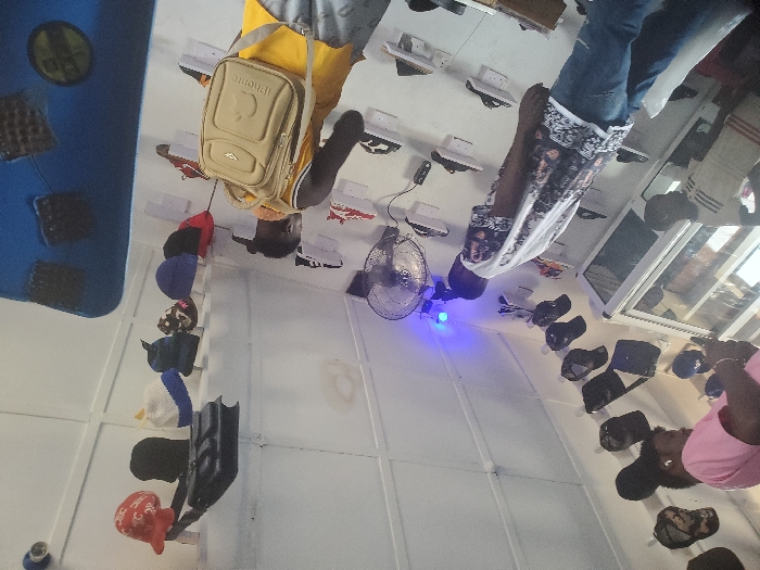 This image depicts the interior of a retail establishment, located in Shendam, Nigeria, likely a shoe or apparel store