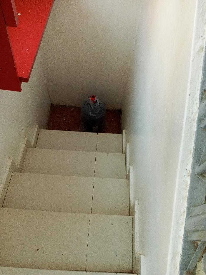 The scene depicts an interior stairwell within a building in Hotoro South, Nigeria, viewed from an overhead perspective looking down a flight of stairs. Approximately seven light-colored, tiled steps descend towards a reddish-brown tiled landing. A dark, cylindrical object, encased in a translucent black plastic bag with a red cap visible at its apex, is positioned centrally on the landing at the base of the stairs. The stairwell walls are painted an off-white color. A red, angular structural element, possibly part of a railing or architectural detail, is present in the upper left quadrant of the image. A partial view of a grey, metallic grill or railing is visible along the right edge of the frame. No individuals are present in the image.