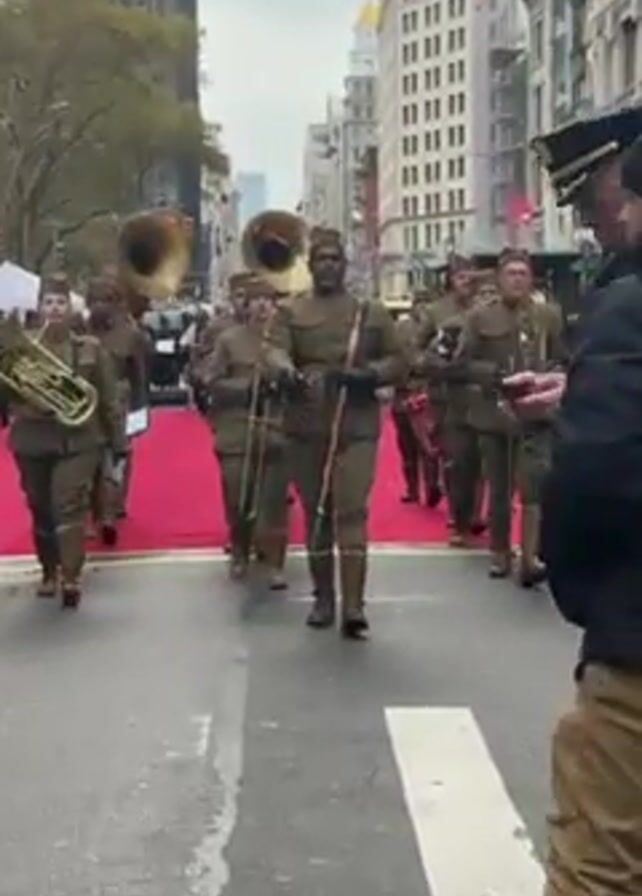 A marching band dressed in tan-colored military uniforms, including hats, marches on a red carpet set on a city street with tall buildings on either side. The band members play instruments like tubas, trombones, trumpets, and drums. Two men stand on the sidewalk to the right of the band; a police officer in a uniform is talking to one of the men, showing him something on a device in his hand. The man is wearing a black coat and brown pants. The sky is overcast. The band continues to march down the red carpet.