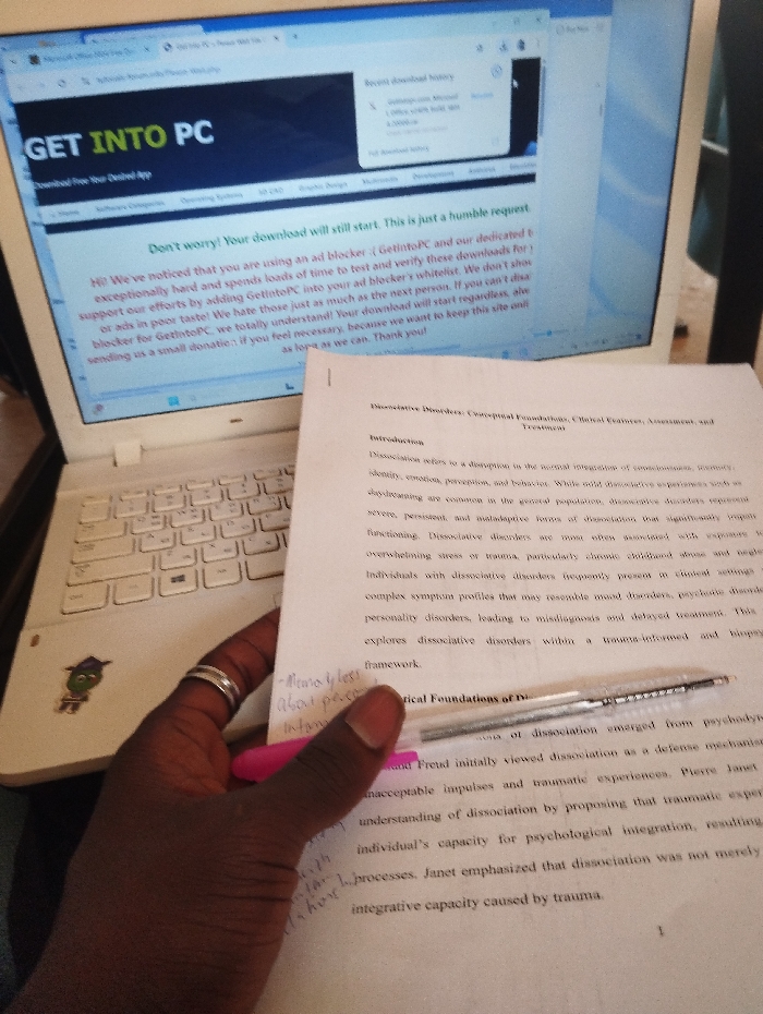 An indoor scene in the city of Wumat, Nigeria, depicts a dark-skinned right hand holding a white paper document and writing instruments. The hand, adorned with two silver rings stacked on the ring finger, grasps a clear ballpoint pen with a silver barrel and a pink highlighter. The document, titled "Dissociative Disorders: Conceptual Foundations, Clinical Features, Assessment, and Treatment," displays typed text and handwritten notes in blue ink along the left margin. In the background, a white laptop with a light-colored keyboard is open, displaying a web browser window on its screen. The browser shows a webpage from "getintopc.com" with a prominent "GET INTO PC" header and a message regarding an ad blocker and a download, stating, "Don't worry! Your download will still start. This is just a humble request." A "Recent download history" pop-up is also visible on the screen. The laptop and document are positioned on a dark, flat surface.