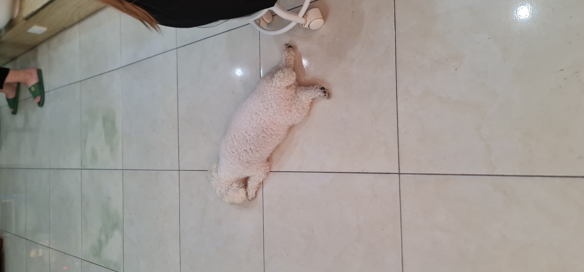 A white Bichon Frise dog is lying on a tiled floor, adjacent to a white chair. Part of a person's legs with green sandals are visible in the background, along with the edge of a light-colored wall. The scene appears to be indoors. The specific location in Đà Nẵng, Vietnam, cannot be determined from the image.