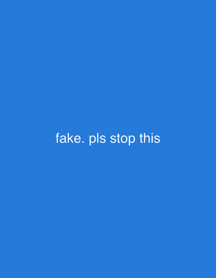 A solid blue background dominates the image. White text is centered horizontally and vertically, spelling out "fake. pls stop this" in a simple, sans-serif font. The text's tone is assertive, expressing a desire for an end to a potentially harmful or misleading situation. The overall impression is one of straightforward communication and a plea for intervention.