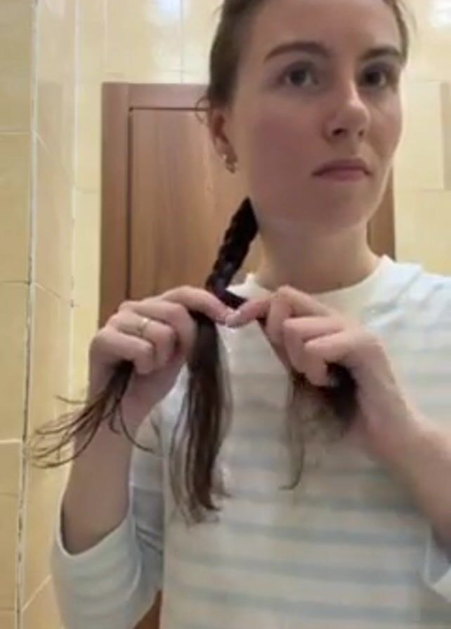 A young woman with brown hair and light skin, wearing a white and blue striped shirt and a wedding ring, stands in a bathroom with beige tiled walls and a dark wood door. Her hair is partially braided down her back. She manipulates the end of her braid with both hands, separating strands of hair. She looks directly at the camera with a neutral expression.