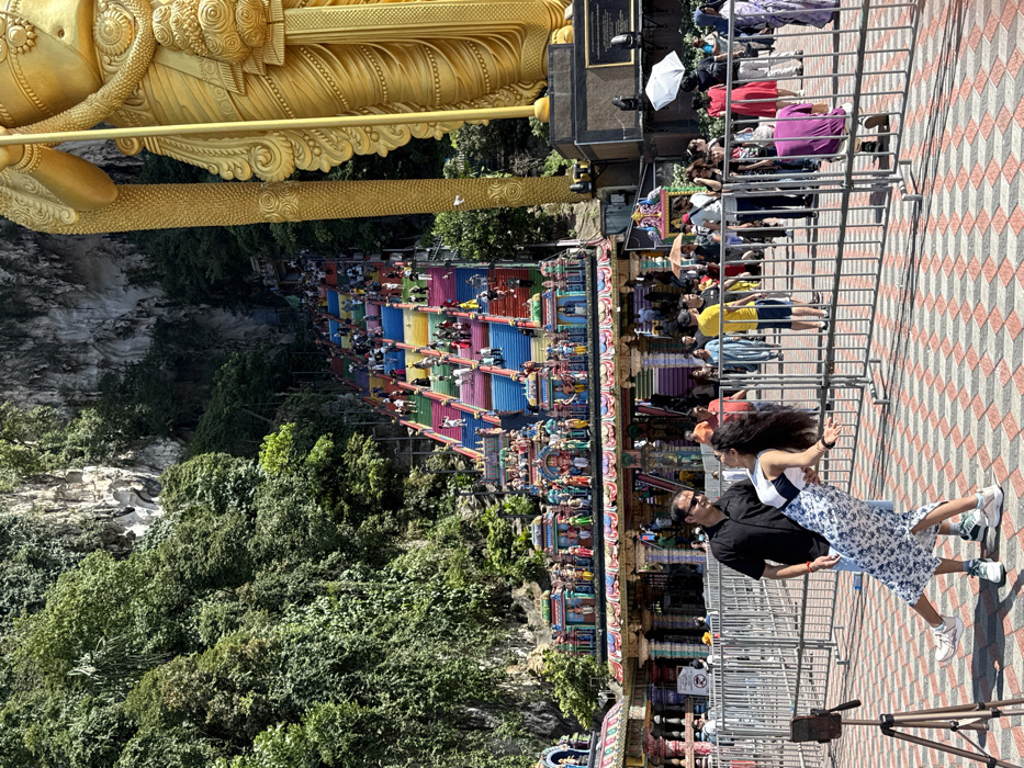 A vertical shot reveals the Batu Caves in Malaysia. A tall golden statue stands on the upper left. A vibrant staircase, full of colorful steps, leads to the cave entrance. Lush green foliage covers the landscape on the left. Crowds of people are visible on the stairs and near the entrance. A couple poses for a photo on the paved ground, with a phone tripod in the lower right. A metal railing separates them from the stairs.
