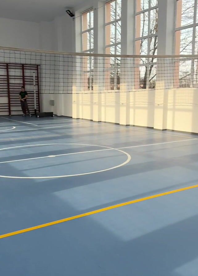 n indoor volleyball court with a blue floor and yellow lines. Two people are present: one in a black shirt and another in a green shirt. They are on one side of the net. The person in black is bouncing a volleyball. The environment includes wall bars, a basketball hoop, windows, and a volleyball net. Sunlight streams through the windows. The camera slowly pans to the right.