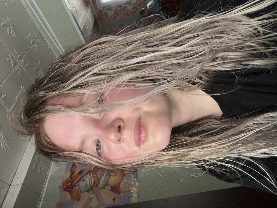 This image depicts an indoor scene in the city of Дойная, Russia. A young female subject is centrally positioned in the foreground, facing the camera directly. She has long, wet, light blonde and brown streaked hair, which is parted and falls across her face. Her skin is fair, with a reddish tint on her cheeks. She wears a dark, possibly black, v-neck top. The background on the left shows a light green wall with a colorful framed artwork featuring a brown dog and a grey cat. Above, a light-colored ceiling displays a decorative, embossed pattern. On the right side of the background, an out-of-focus older individual, appearing to be female with short hair and wearing a light blue top, is visible near a window with floral curtains and a dark piece of furniture.