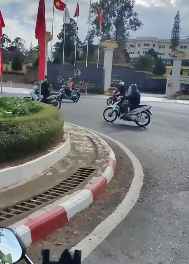 first-person perspective of a person riding a motor scooter on a road in Vietnam. The road has a roundabout with a grassy area in the center, marked by a red and white curb. Several motor scooters are going around the roundabout. In the background is a white building with a row of white pillars at the entrance, and the words "Da Lat Palace" on the gate. Several red and yellow flags of Vietnam are flying near the entrance. The sky is partly cloudy. The camera is mounted on the scooter and the person riding is wearing a helmet and sunglasses.