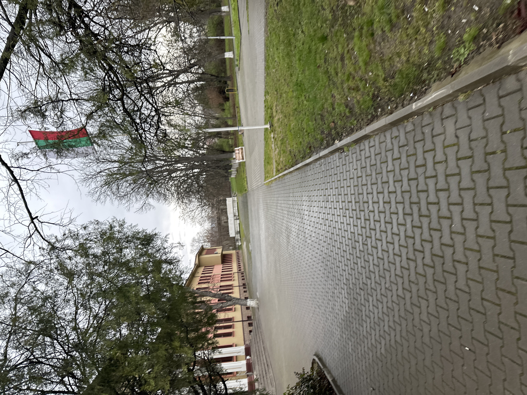 The image displays an exterior view of a public area in Stara Zagora, Bulgaria, under an overcast sky. A wide expanse of wet, grey interlocking paver bricks forms a courtyard or pathway, extending from the foreground into the mid-distance. To the left, a multi-story building, likely an institutional structure, features yellow-tan walls with red window frames and sills, and a prominent entrance adorned with four white classical columns and a set of steps. Numerous deciduous trees, mostly bare or with sparse early spring foliage, line the perimeter, with some tree trunks near the paved area appearing whitewashed. An evergreen tree with dense green foliage is prominent on the far left. In the upper right quadrant, a Bulgarian national flag, displaying vertical white, green, and red stripes, hangs from a flagpole, partially obscured by tree branches. To the right of the paved area, a strip of patchy green grass and exposed soil is visible, bordered by a concrete curb. Several slender white utility poles and a light-colored park bench are present in the midground and background. A long, low white concrete structure is visible in the far background, behind the trees. No individuals are present in the scene.