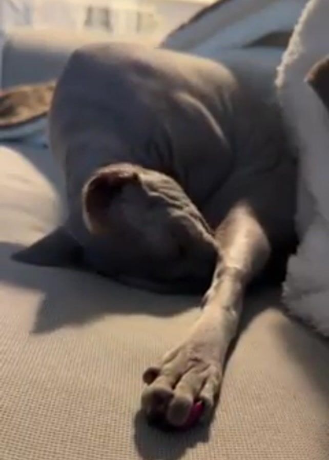 A hairless grey cat is lying on a light-colored textured sofa, grooming itself. Its left front leg is extended, and one toe has a pink cover on the nail. The cat's head is bent down as it licks its leg and toes. Behind the cat is a partially visible pet bed with a white fluffy blanket inside. A television is visible on the wall in the background. The lighting is soft.