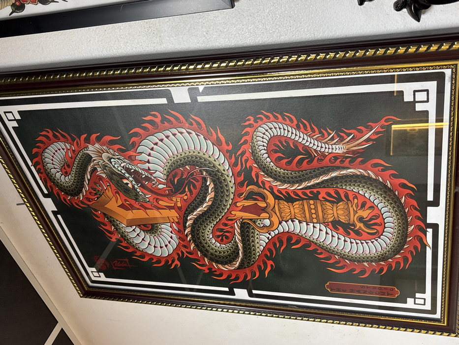 A vertically oriented framed artwork is displayed on a light-colored wall in Nam Hoa Lư Ward, Vietnam. The artwork features a stylized, dark green and light grey-scaled serpent coiled around a central, golden, segmented object resembling a ceremonial dagger or vajra. Red and orange flames emanate from behind and around the serpent and the golden object, set against a dark background. The serpent's head, positioned in the upper center, shows red eyes and an open mouth. The entire illustration is framed by a white geometric border, which includes text in an Asian script in the upper left corner and the English text "THE HANG STUDIO" oriented vertically along the left side. The frame itself is dark brown with a gold inner trim. A portion of another dark-framed item is visible on the adjacent wall to the right. No individuals are present in the scene.