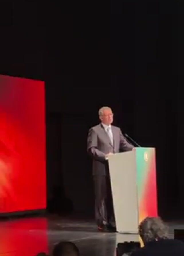 A man in a suit speaks from a podium on a stage to a large audience in a theater