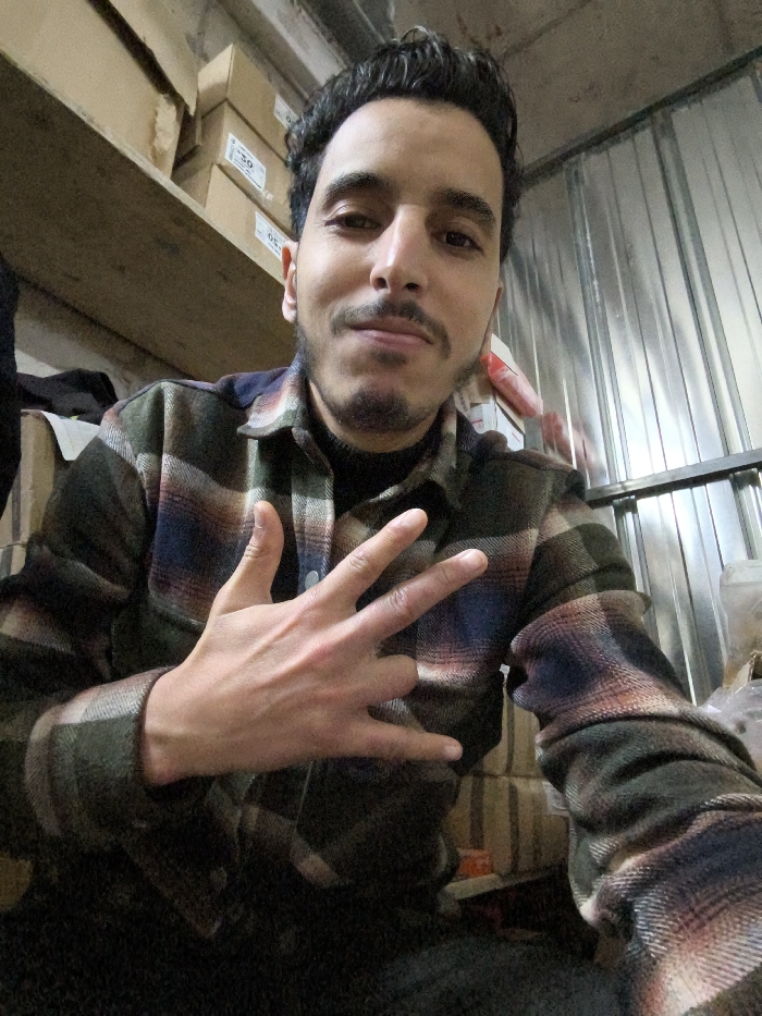 A man poses indoors, wearing a plaid flannel shirt over a black shirt. He raises his hand, displaying a "shaka" sign or a "hang loose" gesture. He has dark hair and a goatee. Shelves loaded with boxes are visible in the background, along with corrugated metal walls.