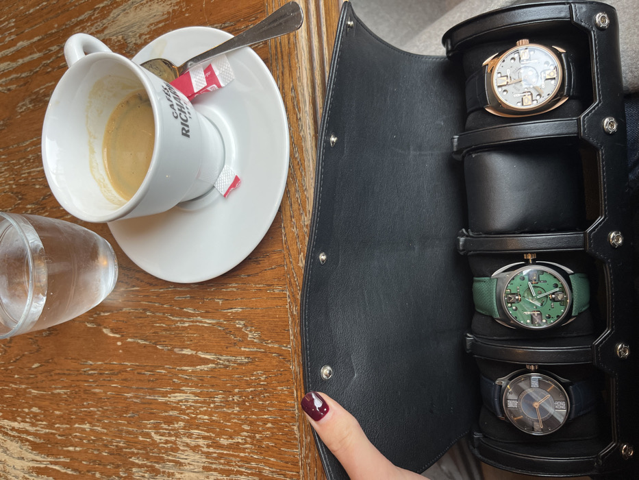 An overhead view depicts a tabletop scene within a café or bistro in Paris, France, identified by the "CAFÉ RICHARD" branding on the coffee cup, a prominent French coffee supplier. A wooden table with visible grain serves as the surface. On the table, a clear glass of water stands beside a white ceramic cup holding dark liquid, consistent with espresso, on a matching white saucer. A silver spoon and two opened red-and-white striped sugar packets rest on the saucer next to the cup. In the foreground, a black leather watch travel roll is presented open. Multiple silver-colored snaps are visible along the top flap of the roll. A human left hand, with fingernails painted dark red, is visible holding the top flap. The roll contains three distinct luxury wristwatches: on the far left, a watch with a dark circular dial and dark strap, displaying the text "BAUME"; in the center, a watch with a green textile strap and an oval-shaped case, featuring a complex green dial resembling a circuit board with visible mechanisms; and on the right, a watch with a rose gold-toned case, a black leather strap, and an intricate white dial exposing multiple layers of internal components.