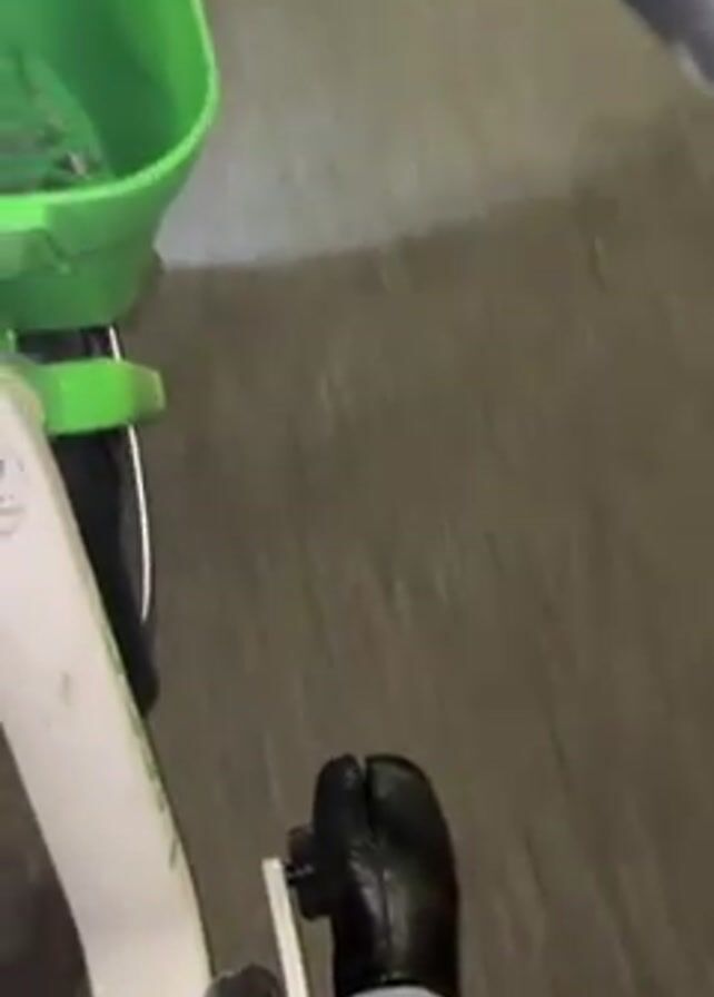person riding a green electric scooter at night. The video is recorded from the perspective of the rider, looking out onto the street. The scooter has a bright headlight. The rider is wearing black pants and black boots. The road is asphalt and has yellow lines. Trees line the side of the road. It appears to be a quiet neighborhood.