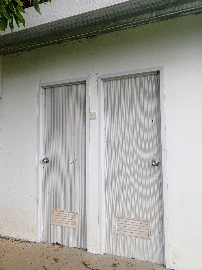 Two adjacent, identical, white doors with vertical grooves stand side-by-side in a white wall. Each door has a round doorknob and a rectangular ventilation grill near the bottom. A light switch is positioned between the doors. The wall is weathered and has a visible crack near the top. Green foliage partially obscures the top-left corner of the image. The ground in front of the doors is concrete with some debris.