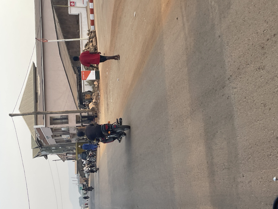 The image depicts a daytime street scene in Ube, Nigeria, under a hazy sky with distant hills on the horizon